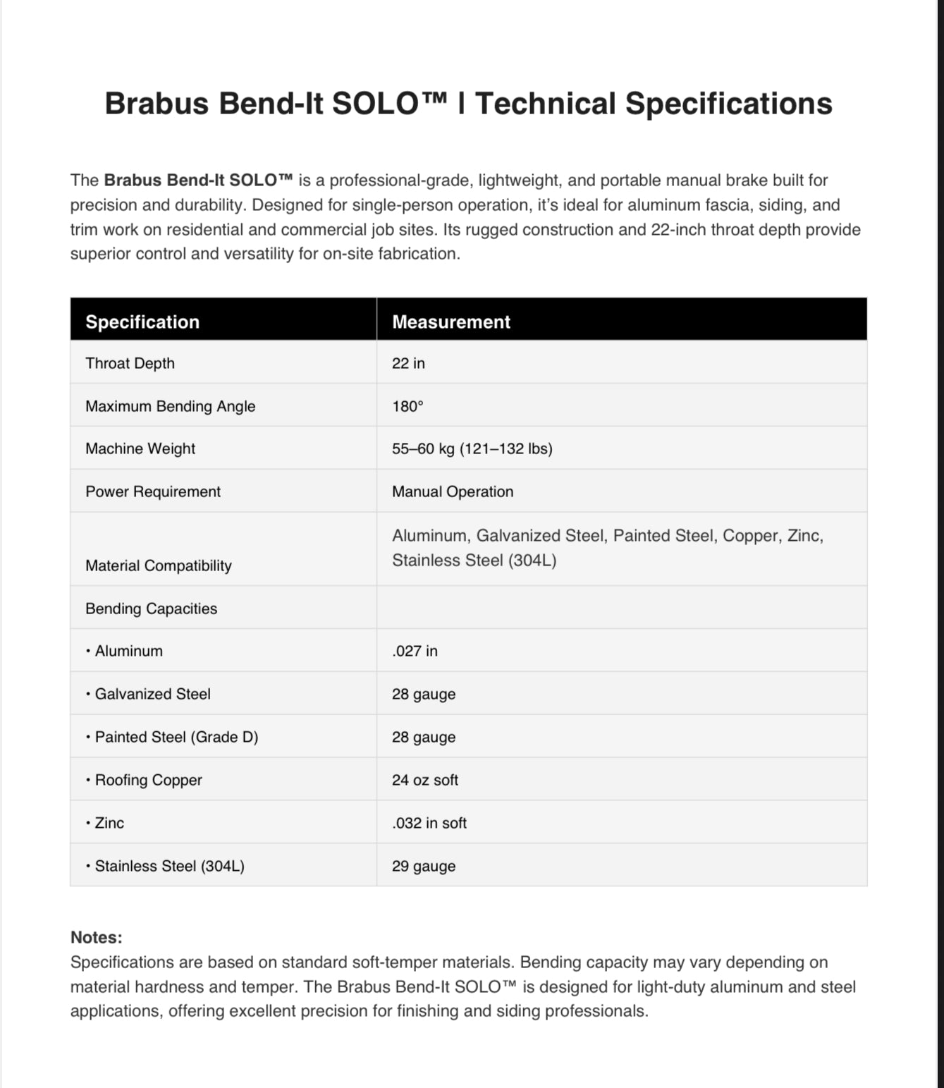 Designed for professionals who work independently, the Brabus Bend-It Solo is the ultimate portable bending solution for aluminum applications. Whether you're shaping fascia, siding, or trim, this model delivers precision and ease without the bulk of unnecessary weight.