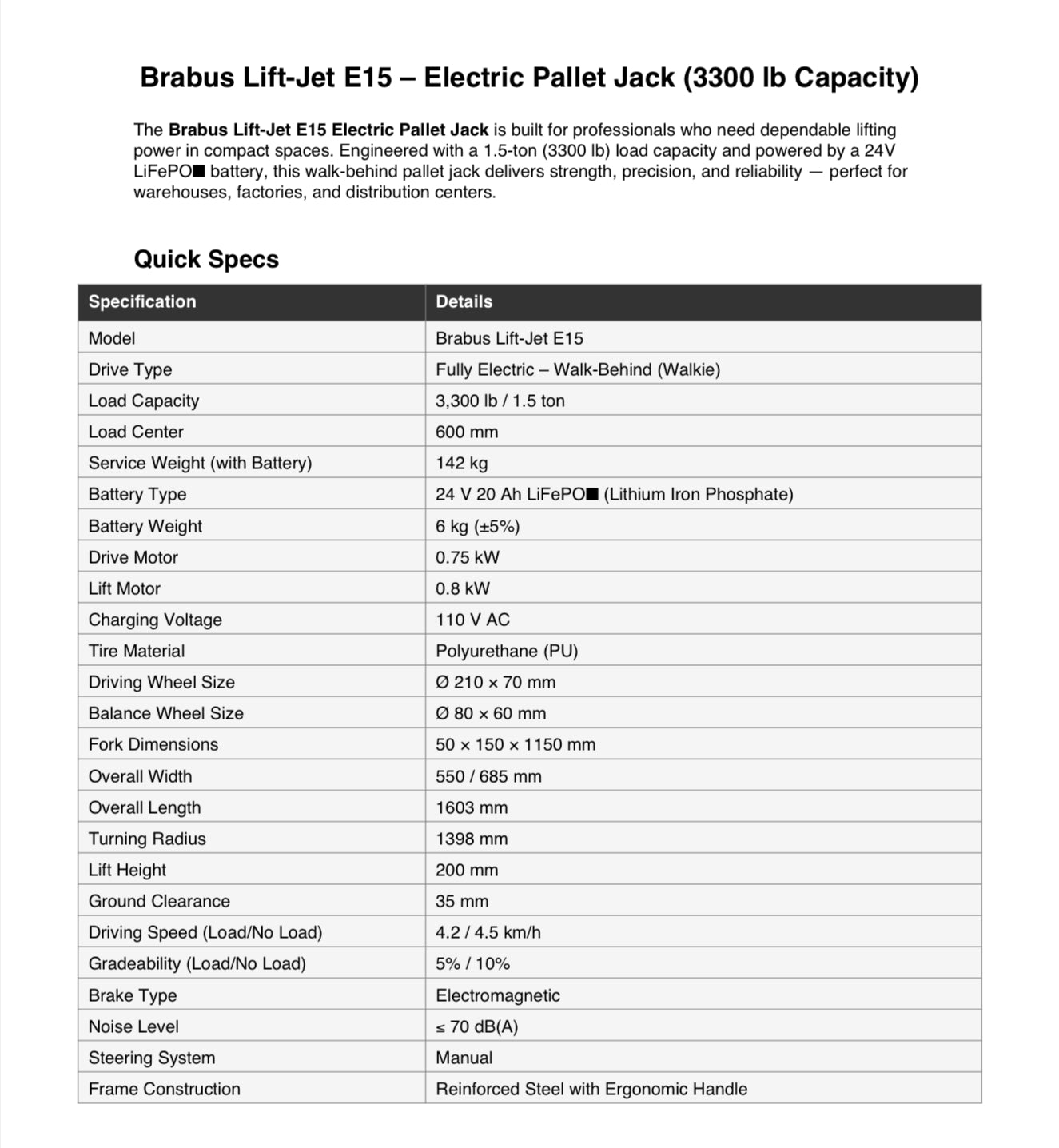 Brabus Lift-Jet™ E15 | Electric Pallet Jack (3300 lb Capacity) Lithium Battery