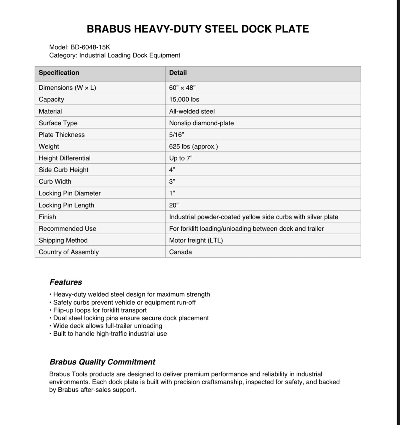 Compact, strong, and built to last — theBrabus Heavy-Duty Steel Dock Plate (60″ × 48″)delivers professional-grade durability for tight-space operations.